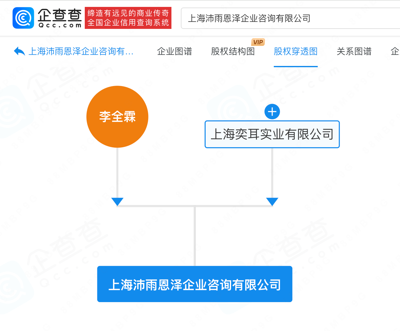 11月26日,上海沛雨恩泽企业咨询有限公司注册成立,注册资本20万元,李全霖(李沛恩)@李沛恩Pein_担任法定代表人,其与上海奕耳实业有限公司共同持股,该公司经营范围包括演出经纪;电影发行;广播电视节目制作经营等。